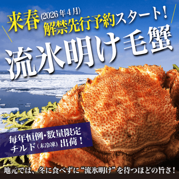 ホーム > カニ通販商品一覧 > 1.毛がに (3特〜4特ランクのみを厳選浜茹で) > 【来春2026/4海明け漁解禁先行予約!!】名物流氷明け毛ガニ(未冷凍チルド発送)【4特ランク】(2尾セット)